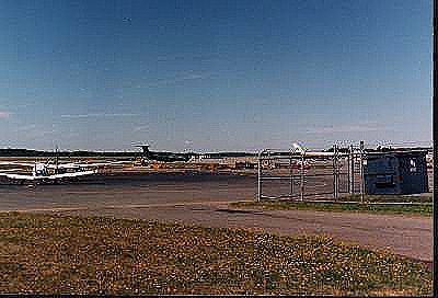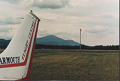 Lake Placid Airport On Monday Claude took us off and flew to Massena to clear customs and refuel. He then took us on to Lake Placid, landing at the airport there. Our club is called the Tri-County Flying Association. There was another group that leased space from us, as well as our club Cessna 172. Their name was the Yarmouth Flight Centre, a flying school. We had to rent the plane back from them for our flight. In the background of the picture can be seen White Face Mountain again, a different view.