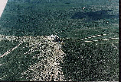 White Face Mountain We crossed Vermont into upper New York State. Then Claude followed the Keene Valley until he reached White Face Mountain. I got a shot as Claude circled. At the peak is a building with an eatery and gift shops. On our side is a tower with a rock near it, which I believe is the spot that has the sign showing the highest spot of the mountain. The road to get up there is seen in the background.