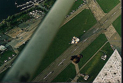 Instead it was a balloon pilot calling Rockcliffe to apologize for coming down on the landing strip.We flew over the airport and saw the balloon as they were pulling it off of the runway, not an easy thing to do. Below us and above the ground was another balloon, a Mickey Mouse head. The background show the Ottawa River with a yacht club near the airport. We flew around for awhile and then finally Claude figured there was plenty of room to land and he did so.