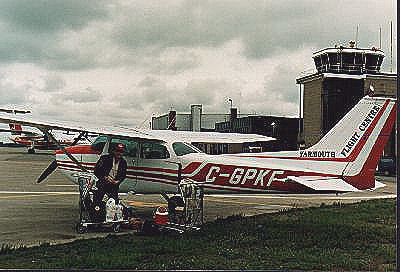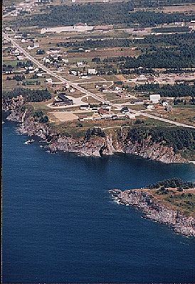 Moncton, NB We finally got to Amherst, had a nice meal and then off to bed. The next day was poor and we were told that it would be mid afternoon before we would be able to carry on. In the picture Claude is stowing our gear. Our flight plan was to go to Amherst and fly over Claude's parents home and then down the Bay of Fundy. My turn and off we went. As we got over the Bay we suddenly hit fog again. I back tracked back over the land and we then headed for the coast with the intent of following the highway to Yarmouth. The cloud base was low and I had to stay at 800' ASL (Above Sea Level). Claude was in contact with Greenwood Air Force Base and as we approached between the base and the Bay we were warned that an Aurora and two other large aircraft were on a flight line from the Bay to the base and that we would be crossing in their path. I headed for the coast where there are 900' hills and then followed the hills.