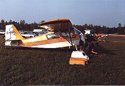 Rockcliffe Flying Club We went to Rockcliffe and got a tie down area for the week-end. The next day I flew to GGC and we spent the day there. Claude flew us back to Rockcliffe. As we we approached the airport we heard radio talk about Hot Air Balloons in the area. Suddenly ahead we started to see them There were a total of about 150 and we counted 48 at one point. They were stretched across in front of us as far as we could see from left to right. We were concerned about getting past them until we saw an eliptical opening that looked big enough for us. We passed through and then heard a balloon pilot calling Rockcliffe. We were both afraid that he might be complaining about us, even though there was plenty of room.