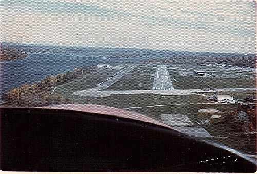 Bangor Airport I took off from Lake Placid and flew back over our outgoing track. We were not landing at Bangor but were close enough to get a picture of it from the air. Our next landing was at Norridge Wock, Maine, for fuel. We intended to go from there to Eastport to have dinner at a restaurant that Claude thought was great. The forecast for fog was poor so we decided to head for home with a stop at St. Stephen to clear customs. As we started across the Bay of Fundy we had to go high because of the fog. Yarmouth reported that it was closed in. We headed for Digby and then got the same report. Claude then decide to head for Moncton, NB where he could call his parent's home in Amherst, NS, and get a ride home where we could stay the night.