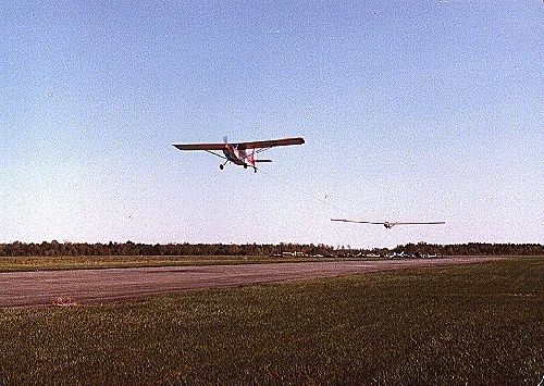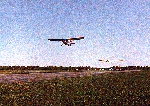 The second picture show a tow plane and glider as they start to climb together. The flight line can be seen in the background with a number of aircraft and the field manager, helpers and pilots. The third picture shows the tow plane landing. He has just released the rope which can be seen over the glider at the right middle of the shot. The rope end nearest to the tow plane has a steel ring that was attached to the plane.