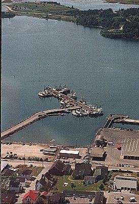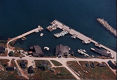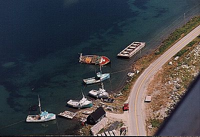 Another Fishing Dock This scene is a little further up the coast. The village up the hill in the background is Port Maitland. To the left of the main wharf is a beautiful beach with a parking lot behind it and an area with picnic tables and stone BBQ's. At low tide you can walk out past the bend in the wharf. One time Marge and I were about 100 feet from the wharf with our poodle Tara II. The tide was coming in as we sat with our backs to the water, on our folding chairs. All of a sudden a big wave came and came half way up the chairs and tossed Tara up to the sand bank. It was startling but something to laugh at.