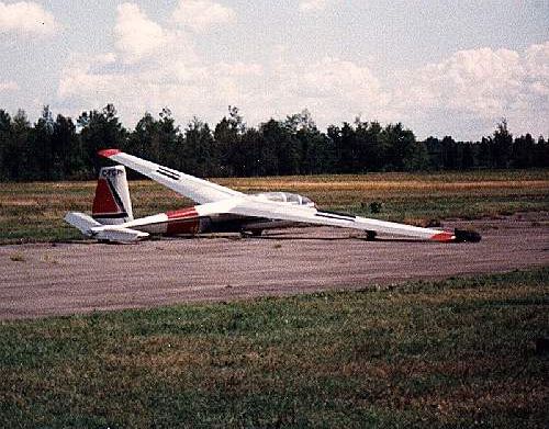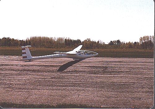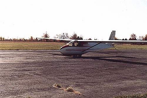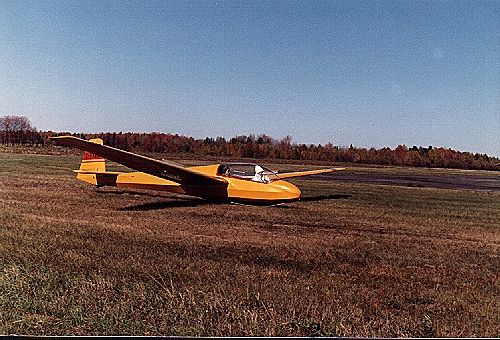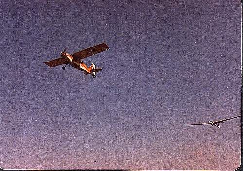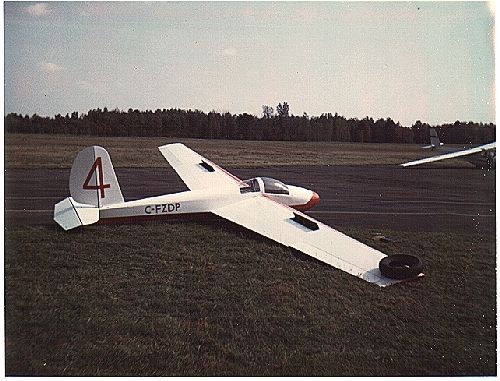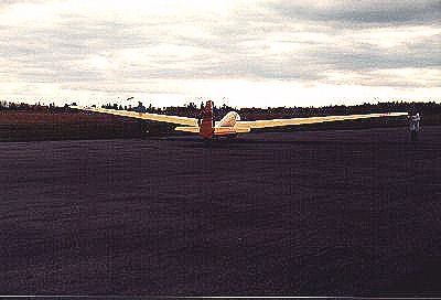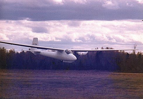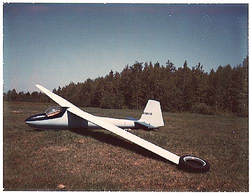 I bought my share on 12th May, 1973. The Skylark was built in 1958 and the company that built it stated that it would last ten years. It was already five years past and as of 1999 it is still flying at the same club. In 1958 one of it's kind won the world championship. The wing span is 60 feet with a deep chord. That enabled it to soar with very light lift. By the time I bought it glass ships were around with very shallow chord, long wings. They had something that the Skylark did not, penetration. That means that they could increase speed and not lose height very fast. The Skylark was a good soarer but had poor penetration. As soon as you picked up speed it would sink quickly.