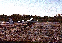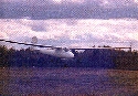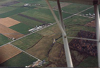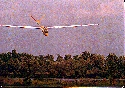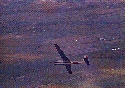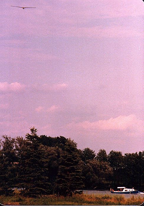 The first picture above shows a glider just before touch down. The river can be seen ner the bottom of the picture. The second shot shows another glider, a glass one, just turning final in the upper left hand corner while a boat passes on the river in the lower right corner. Glass ships, being more modern, are faster and have better penetration than the older styles. They would actually do their base leg across the river.