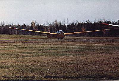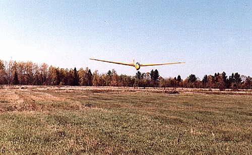 The glider is a few feet from the ground on his final approach. The single main wheel and the tail wheel can be seen.