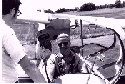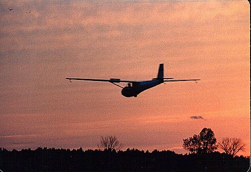 The third shot show a woman student pilot on her first solo. She did it just as the sun was setting, the only time I have ever seen this. The left spoiler of the 2-33 can be seen in the open position. This woman later became a partner with myself and two other fellows in the ownership of an ex towplane that we purchased from GGC when they renewed their two. It is a Champion, OGW, which we leased to RVSS to be used as one of their tow planes.