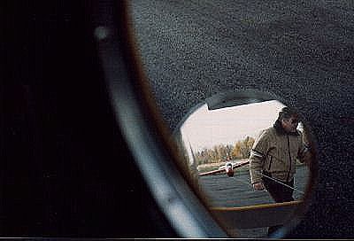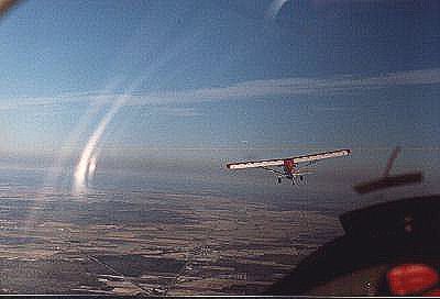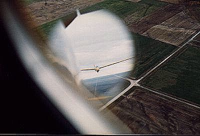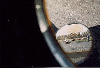 The first picture shows me sitting in the tow plane waiting for the hook-up to be made. At the bottom of the picture, by the door, can be seen part of a mirror. Most power planes do not have mirrors but it is required with a tow plane so that the glider can be seen, especially at release when the glider pilot releases so that the tow pilot can immediately make his dive to the left, while the glider pilot climbs to the right..