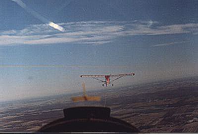 The glider pilot keeps the middle of the tow plane on the horizon to maintain the correct level of flight. Attached to the front of his canopy is a yaw string to indicate whether he is maintaining a co-ordinated flight or is yawing or slipping. Gliders use it in place of a power A/C's ball. The yaw string is more sensitive and easy to answer to.